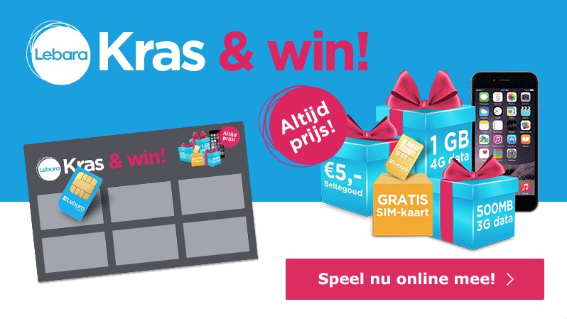 Bij Lebara Mobile kun je momenteel fantastische prijzen winnen door mee te doen aan de unieke Lebara ‘Kras & Win’ actie. Je kunt gratis online meespelen zonder verplichting en ‘krassen’ doe je met de computermuis. Er zijn leuke prijzen te winnen zoals een gratis iPhone, SIM-kaart, 1GB data of beltegoed! En meedoen=winnen, want je scoort altijd een prijs!