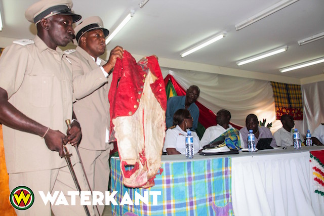 Een kapitein toont tijdens een krutu vorige maand in Brokopondo centrum de versleten jas waarin de toenmalige granman Kwaku Etja in 1783 een veldslag had verloren. De kapitein werd bijgestaan door een bajsa die de sabels van de strijder aan het publiek toonde.