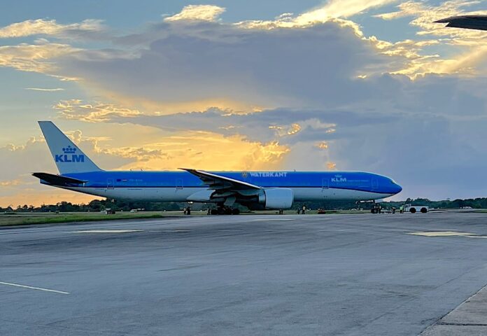 Een toestel van KLM is vrijdagmiddag op de Johan Adolf Pengel International Airport (Zanderij) bijna in het gras naast de rolbaan(*) beland tijdens het taxiën voor vertrek.