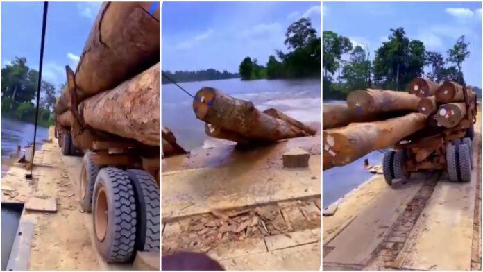 Een truck beladen met houtblokken is donderdagmiddag 26 februari van een drijvende ponton in de Suriname rivier gekanteld.