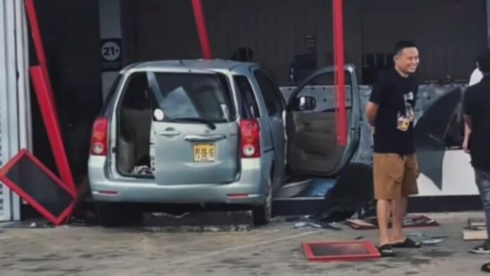 Een auto is woensdagmiddag een Suribet-shop binnengereden op de kruising van de Magentakanaal- en Mopentiboweg in Suriname.